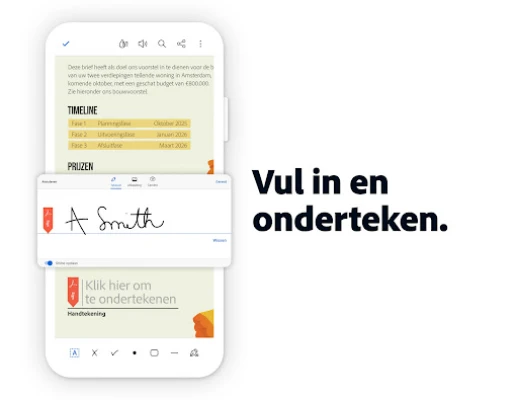 De krachtige functionaliteiten die u kende van Adobe's Fill & Sign-app zijn nu naadloos geïntegreerd in Adobe Acrobat Reader. Dit maakt het invullen, ondertekenen en veilig verzenden van formulieren sneller en intuïtiever dan ooit tevoren. Zelfs een papieren formulier legt u eenvoudig vast met uw camera, waarna u het digitaal invult op uw telefoon of tablet en elektronisch van een handtekening voorziet. Ontdek deze en vele andere mogelijkheden nu met een gratis proefperiode van 7 dagen.