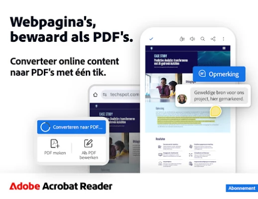Ook zonder abonnement biedt Adobe Acrobat Reader een robuuste set tools voor optimaal gebruik. Bekijk uw PDF's met ongekend gemak, dankzij de innovatieve Liquid Mode die documenten aanpast aan uw scherm voor een vloeiende leeservaring met aanpasbare lettergroottes. Voeg eenvoudig aantekeningen toe, markeer belangrijke secties of teken direct op uw documenten voor snelle feedback. Deel bestanden moeiteloos met anderen en beheer al uw documenten efficiënt door ze op te slaan in de cloud, naadloos gekoppeld aan diensten zoals Google Drive, Microsoft OneDrive en Dropbox, zodat ze altijd en overal toegankelijk zijn.
